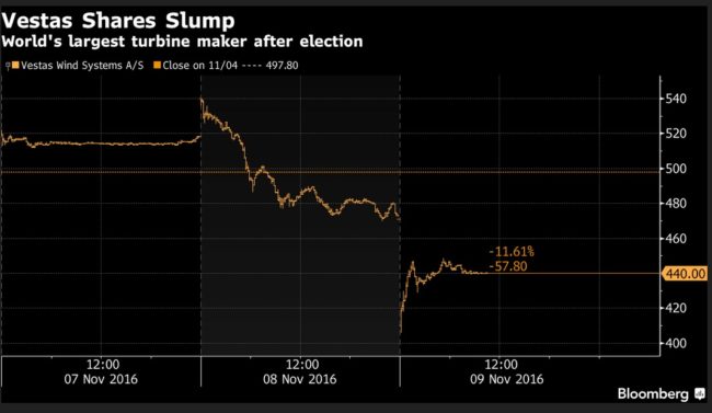 “El resultado es sin duda un golpe para la industria de las energías renovables”, dijo Matt Loffman, analista del consultor de energía Douglas-Westwood en Houston. “El resultado histórico de las elecciones es quizás una buena noticia para una industria de hidrocarburos que ha estado en las cuerdas durante más de dos años”.